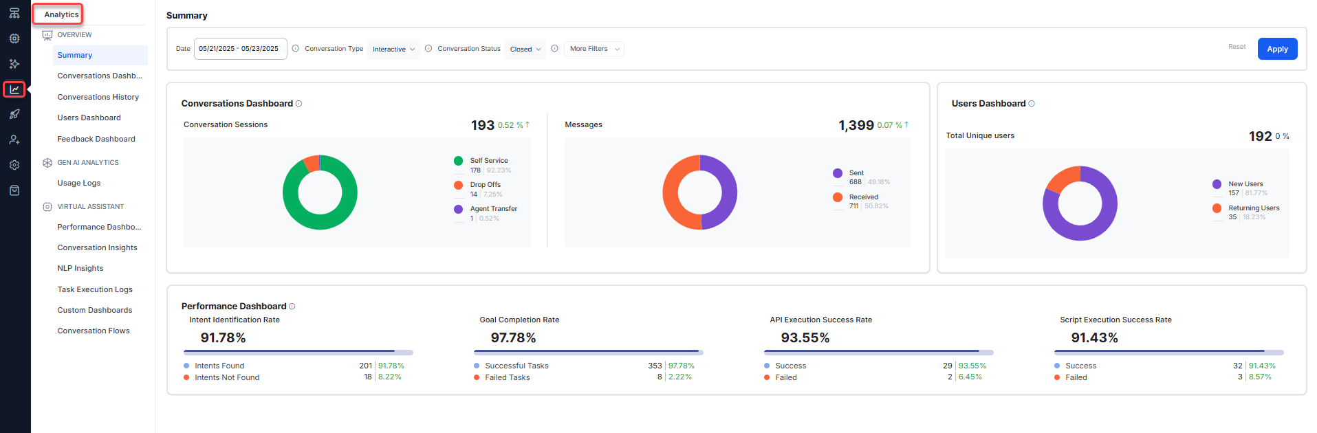 - Conversations Dashboard: Displays the key AI Agents metrics and insights into the usage and containment of the conversations. You can view the conversations’ trend with the breakup of self-service, drop-off, and agent transfers. Learn more.