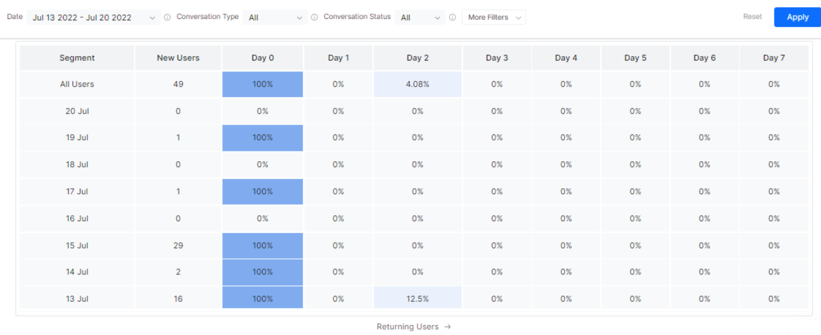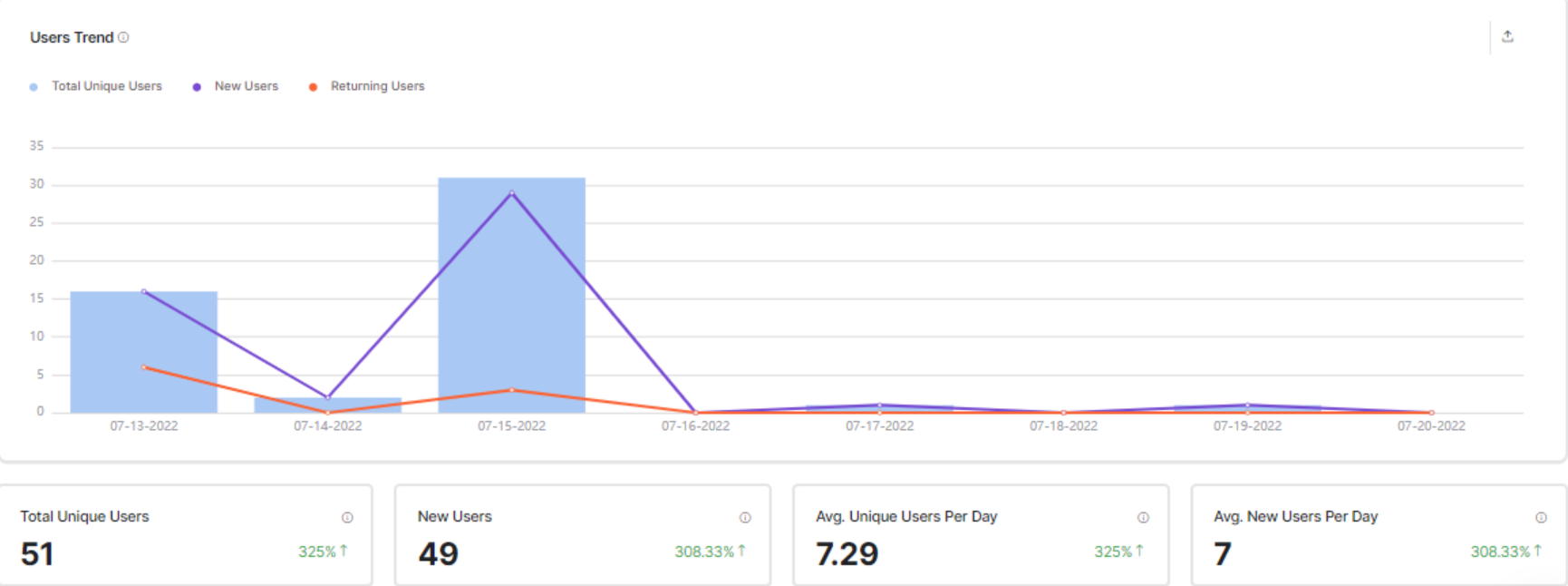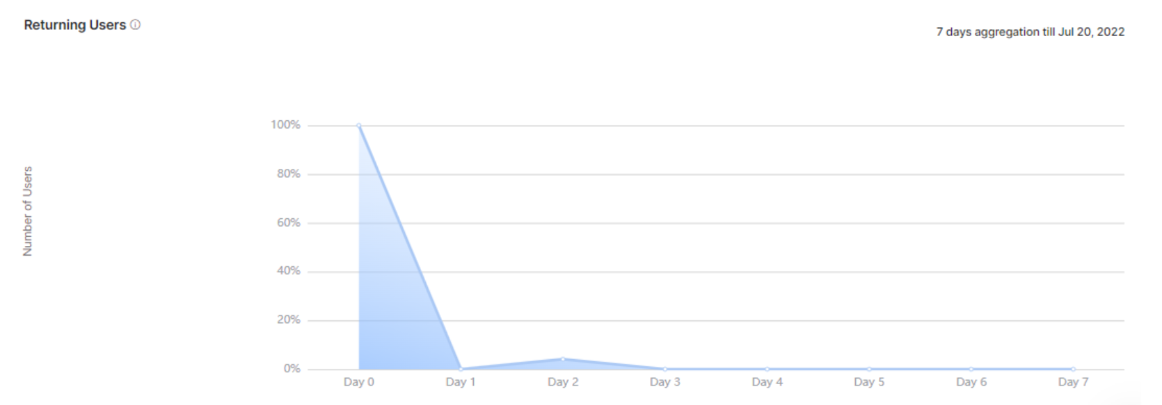 Cohort Analysis: This data visualization chart plots the weekly new users and the percentage of returning users based on the formula (Returning Users/New Users)*100 on consecutive days to determine the retention rate. The Users Dashboard displays the Day N retention of daily, weekly, or monthly cohorts, within a customizable range of dates. For example, if you’re looking at the retention of daily cohorts acquired from July 13 to July 20, 2022, based on the filters selected, and the actual users returning on Day 2, the following Cohort Analysis Chart is displayed: