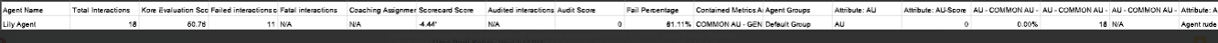 | Agent Name | Total Interactions | Kore Evaluation Score | Scorecard Score | Audit Score | Fail % | Coaching Assignments | Contained Metrics & Adherence Summary |