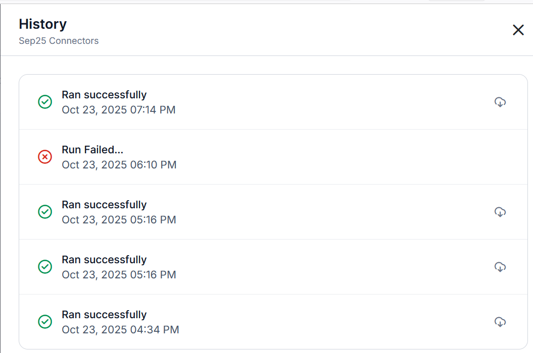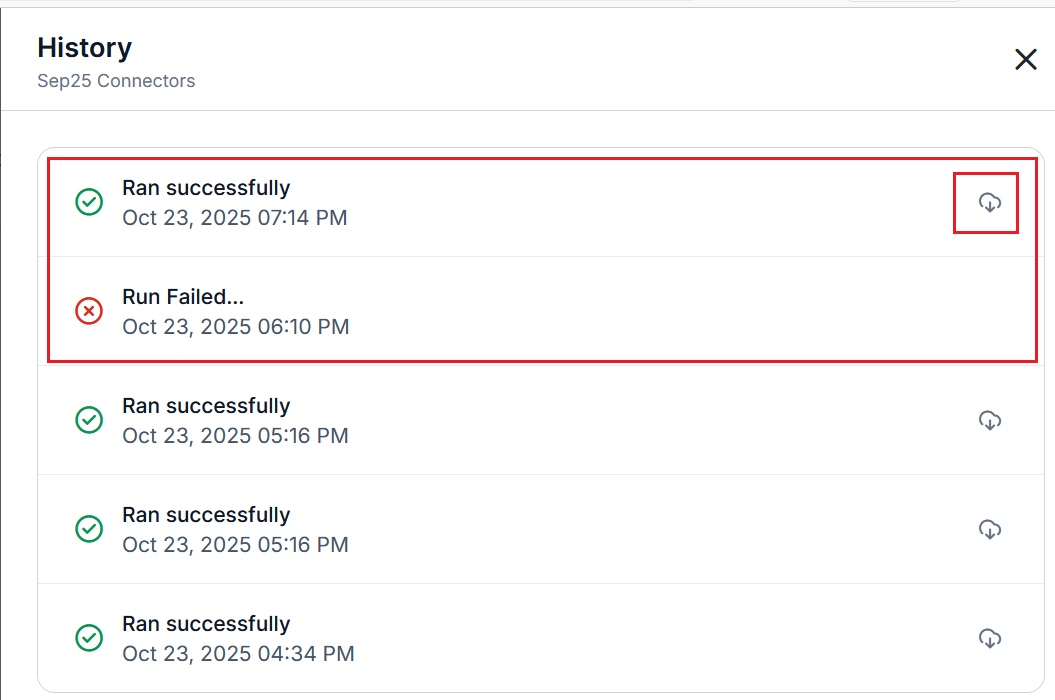 View the generated report history (Successful, failed, and in-progress records) and download the required CSV files.