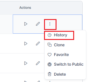 ): Select the vertical ellipsis menu button to view and execute more options, such as view history, clone, favorite/unfavorite, switch to public/private, and delete. |