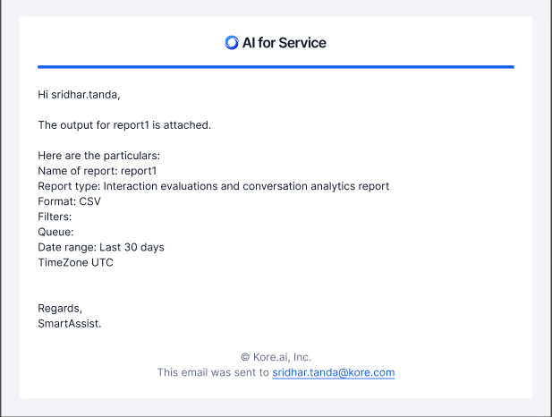 The Quality AI scheduled reports feature provides a structured framework for monitoring, evaluating, and improving agent performance. It enables the tracking of agent productivity, adherence to quality standards, and interaction effectiveness, while providing insights into operational efficiency and compliance with evaluation metrics. Scheduled reports help teams identify coaching opportunities, align performance with organizational goals, and drive continuous improvement.