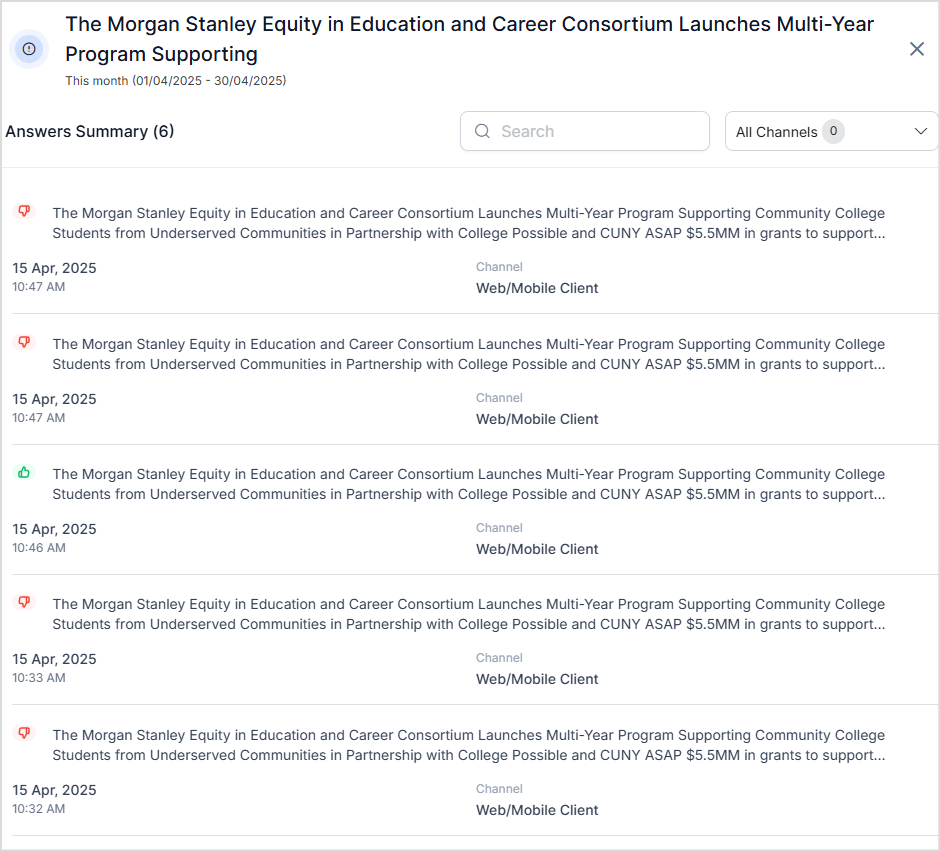 - Feedback: Records the positive or negative feedback received on the answer. If an answer gets a mix of both, the majority sentiment is displayed. For example, if an answer receives 20 feedback responses, with 16 being positive, the feedback is shown in green with a count of 16.