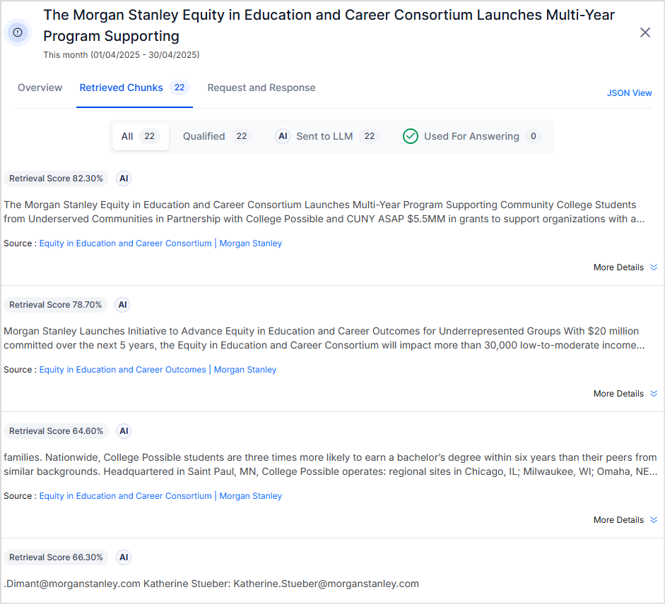 Retrieved Chunks: Lists the relevant retrieved chunks, the top chunks sent to the LLM for answer generation, and the specific chunks used in the final response. This helps evaluate retrieval accuracy.