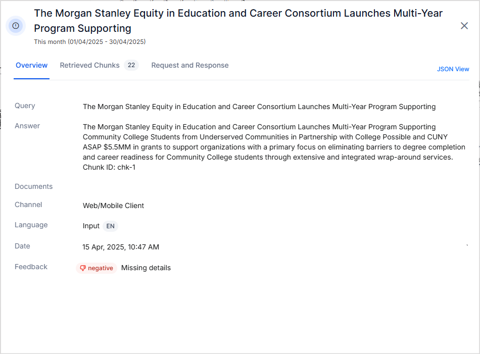 Overview: Displays the query, the generated answer, and metadata such as when and how the query was posted. It also shows the feedback given by the user on the answer.