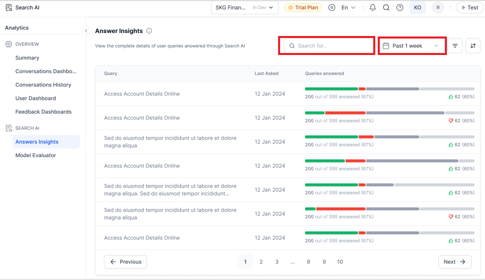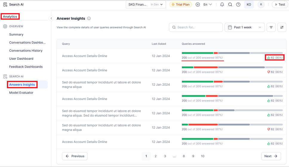 Answer Insights offers comprehensive analytics for each query-answer interaction within the Search AI application. This feature provides an intuitive interface, allowing users to view and analyze data related to answer performance.