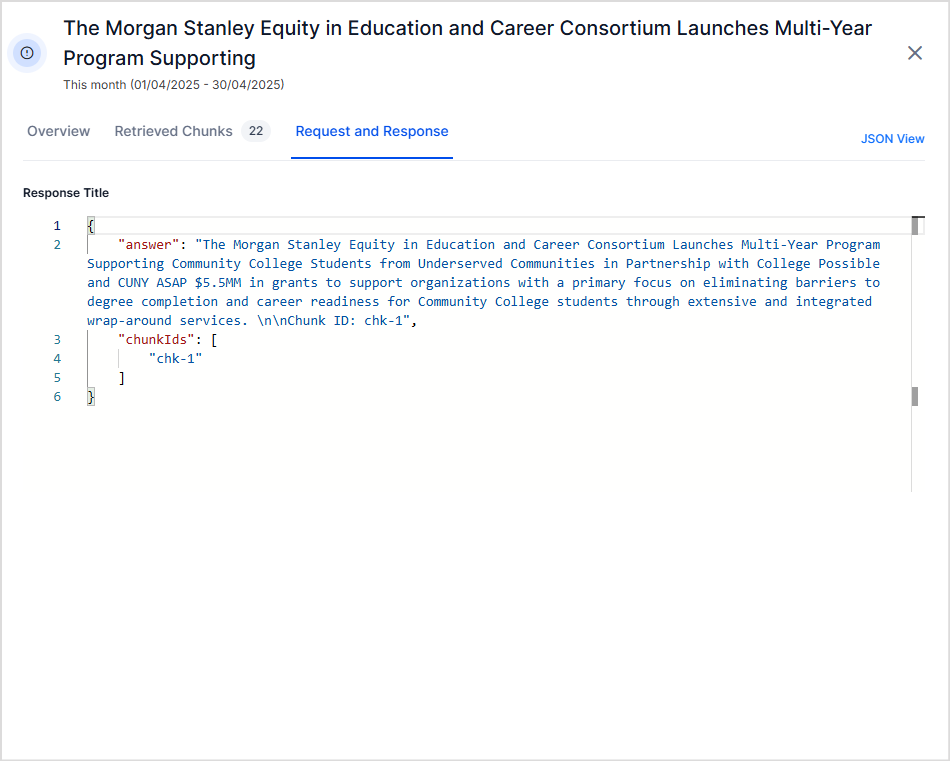 For every query, you can access detailed insights, including the generated answer and retrieved chunks. This helps assess the application's response accuracy and behavior.