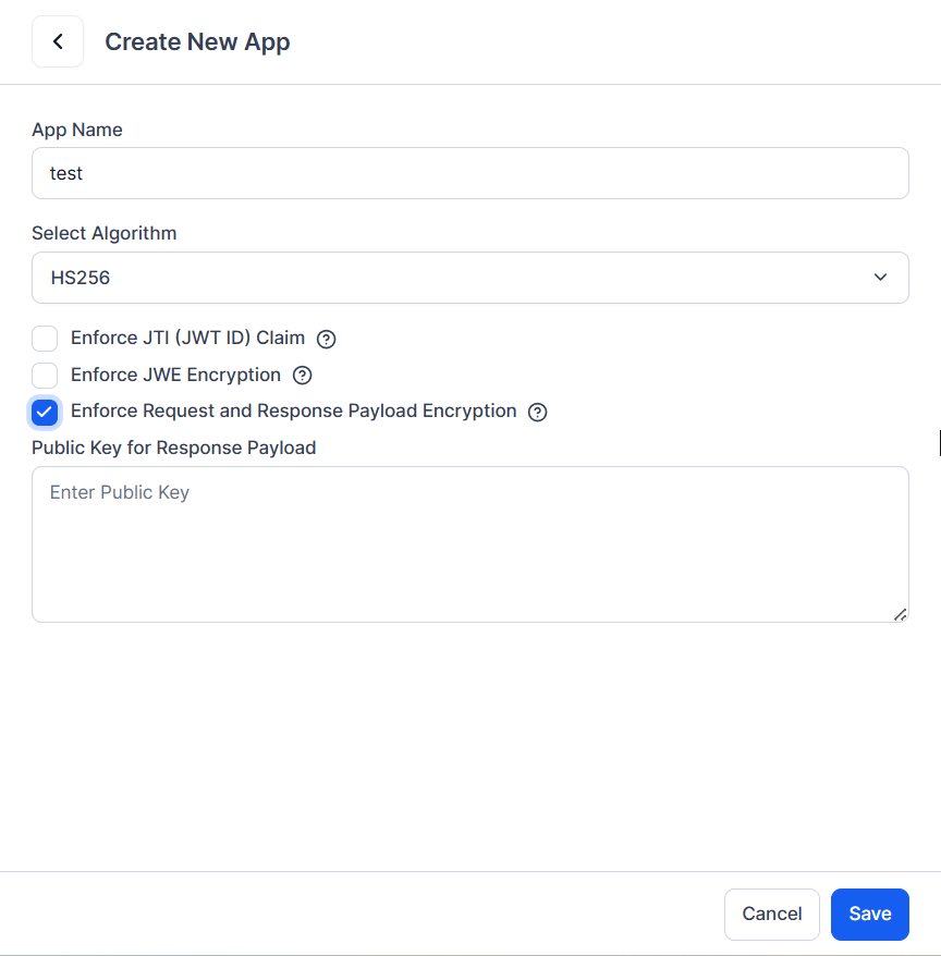 When the Enforce Request and Response Payload Encryption option is enabled, you must provide a public key. The platform generates a secure AES-256 encryption key, which is used to encrypt the public API request payload before sending it to the server. Once the server receives this encrypted request, it processes it and returns the encrypted response payload along with the AES key, encrypted with the client’s public key. Only the client that owns the matching private key can decrypt the AES key and access the original request and response data. This feature adds an additional layer of security for sensitive information, ensuring confidentiality and data integrity across all API communications.