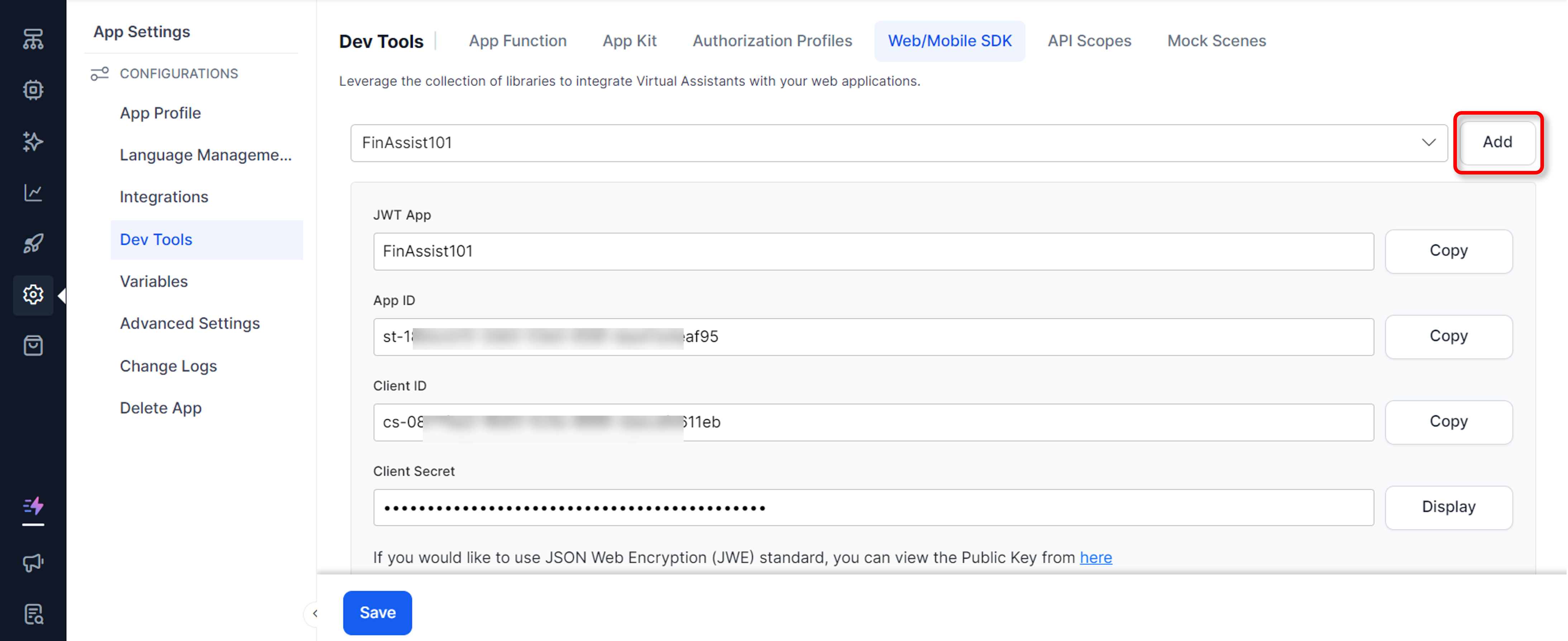 If you are creating a JWT app for the first-time, click the Add button. Alternatively, select the Create JWT App option from the JWT App drop-down list.