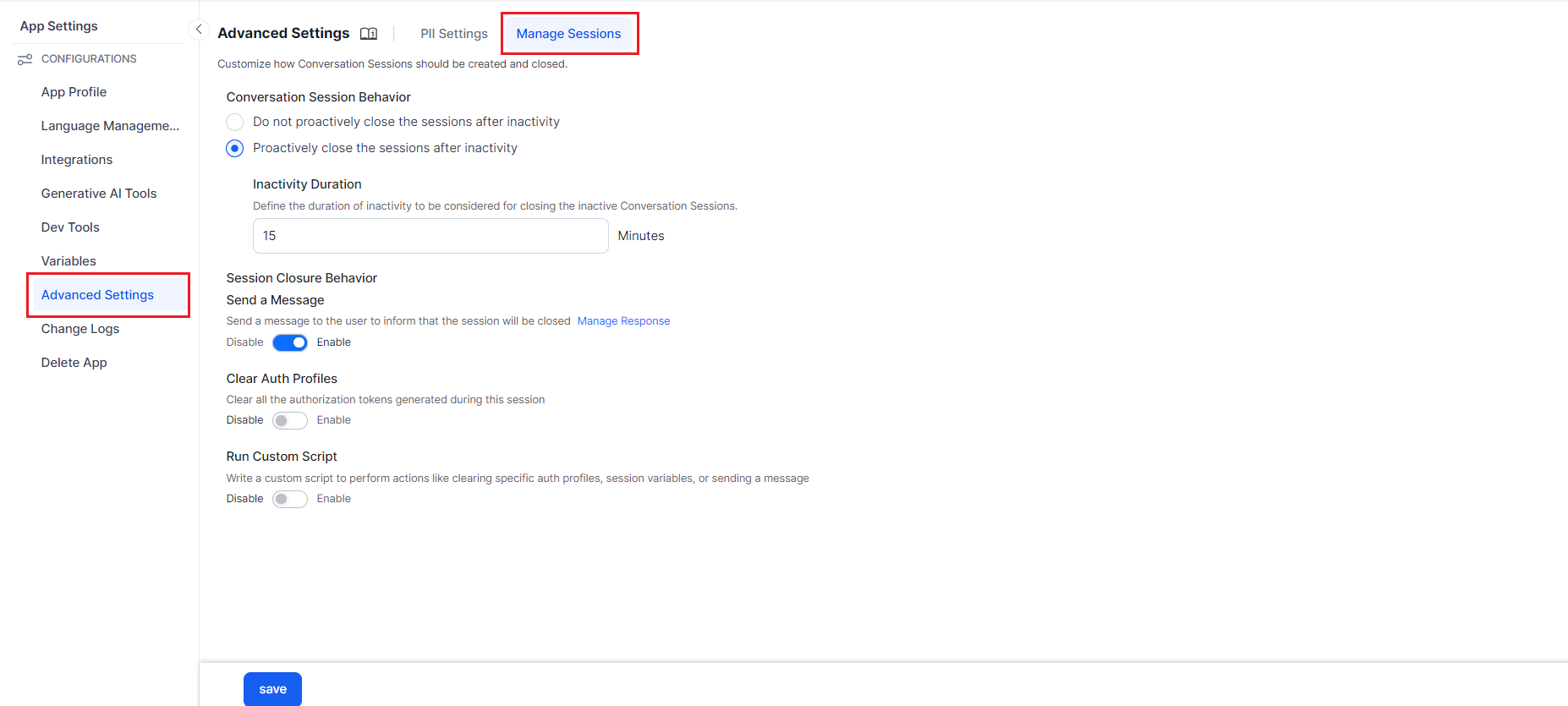 You can define the Conversation Session behaviors in the Manage Sessions tab within App Settings > Advanced Settings tab.