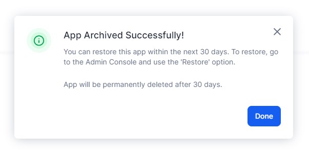 After successful verification, the app is soft-deleted. A published app with active dialog tasks can be restored within 30 days from the admin console. If the app hasn't been published yet, app will be deleted immediately.
