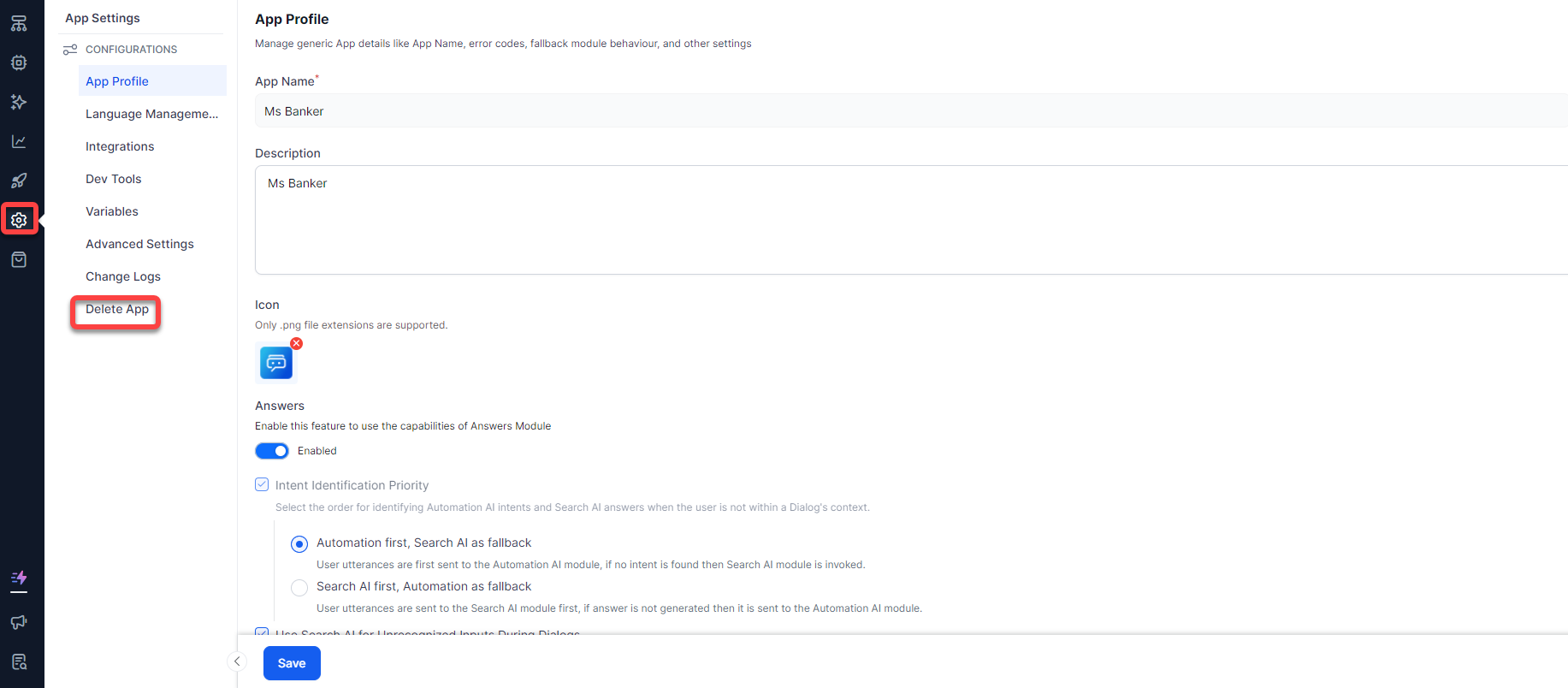 The Delete App option allows you to delete your App. To delete your app, follow the below steps: