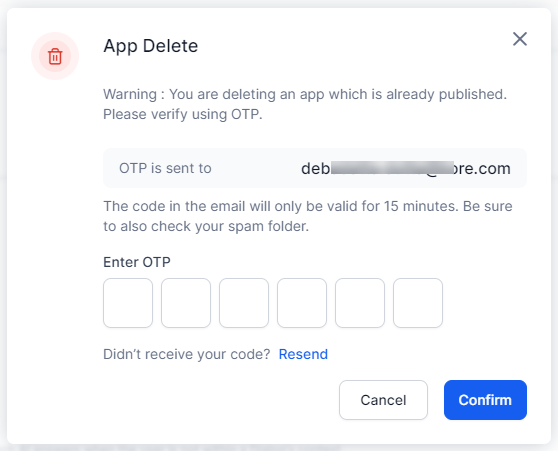 A verification code is sent to the app owner's registered email. Enter this code to confirm deletion.