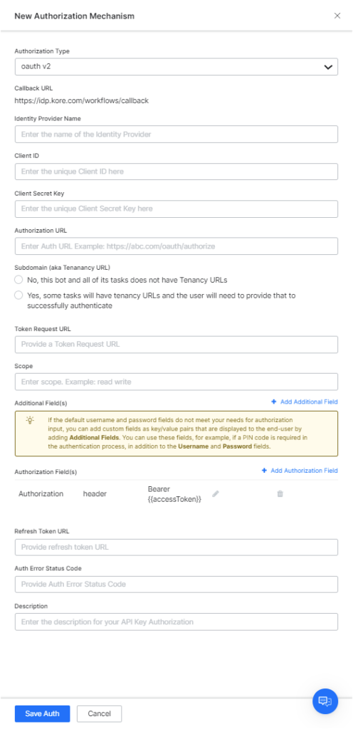 | Callback Link | The URL used by the web application or web service to redirect the end-user after end-user authorization is complete. This value, https://idp.kore.ai/workflows/callback/ is provided as a read-only value by the XO Platform when you define oAuth v2 settings. |