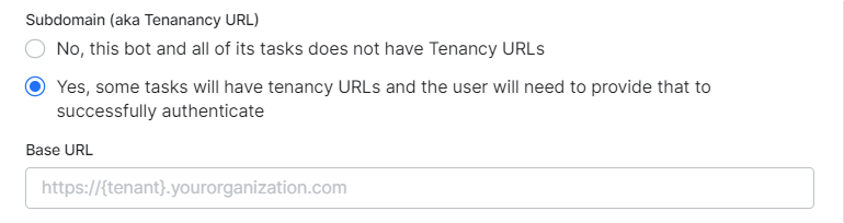 If required, in the Subdomain section, select Yes if the base URL for a web application or user interface that uses a tenant name in the URL.