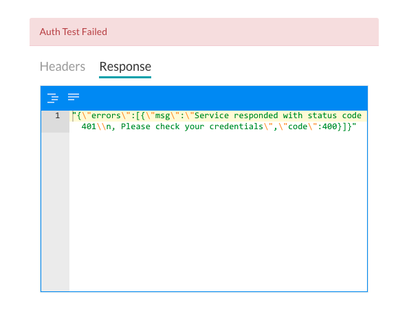 When the validation of authentication is complete, the Test Authorization dialog is closed and the results of the validation, either success or failure, is displayed to the immediate right of the Test Authorization button. If the authorization fails, the Auth Test Failed message is displayed along with the Headers and Response tabs as shown in the following illustration.
