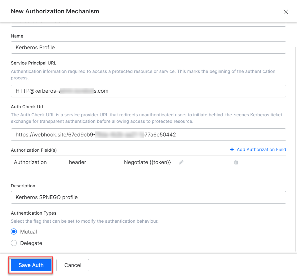 - (optional) Click + Add Authorization Field to add additional fields for Kerberos authorization. For more information, see the Adding Authorization Fields section.
