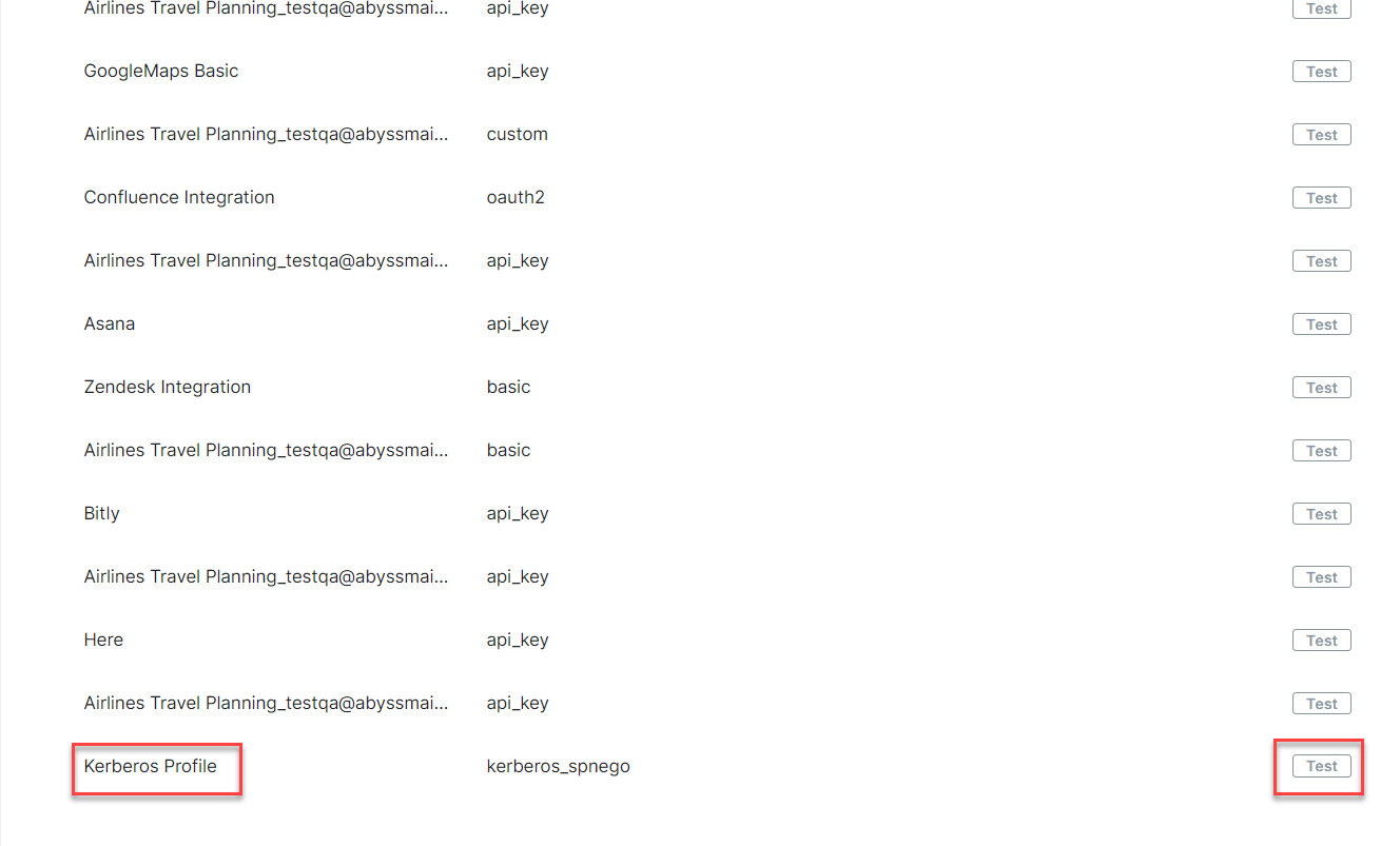 Click on the Test button in the Kerberos Auth Profile row to begin the authorization test.