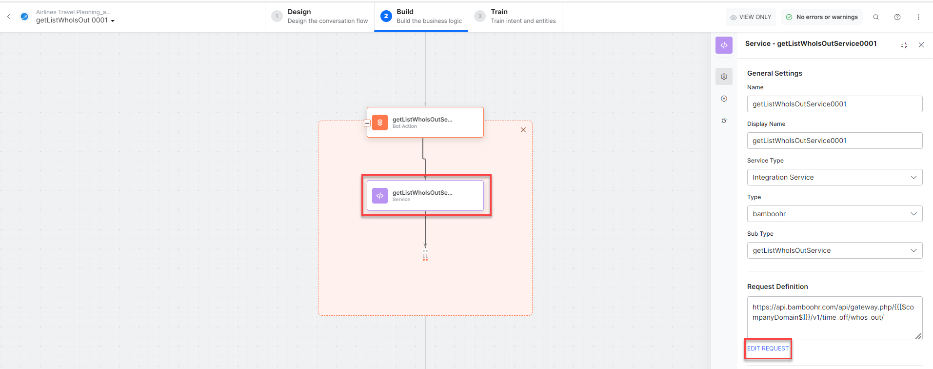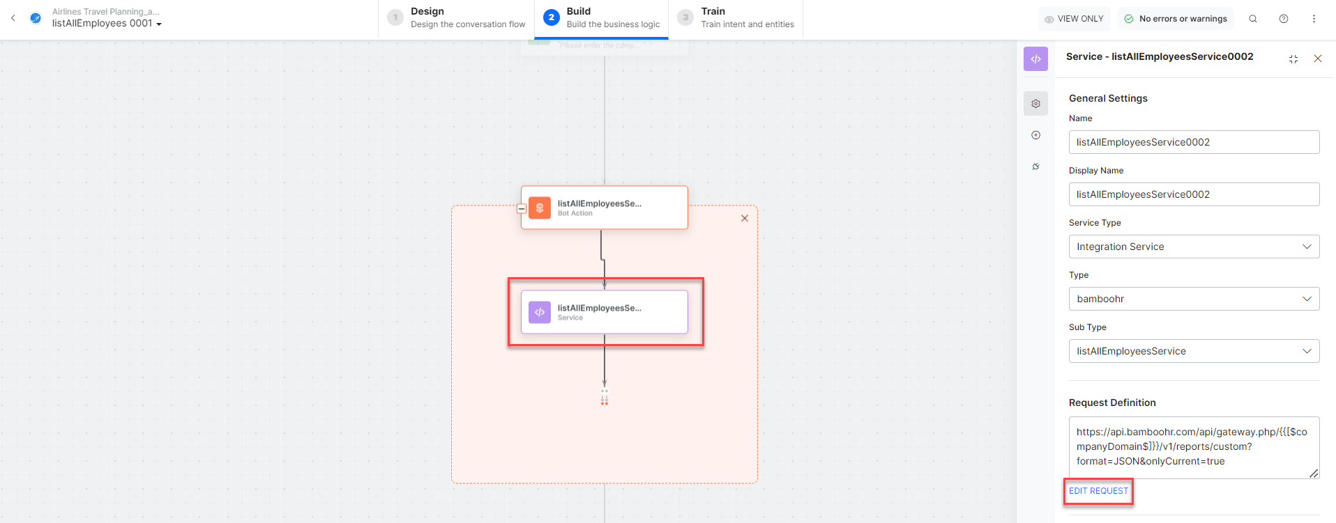 You can use the Prebuilt Action Templates from your BambooHR integration to auto create dialog tasks and test them using the Talk to Bot option.