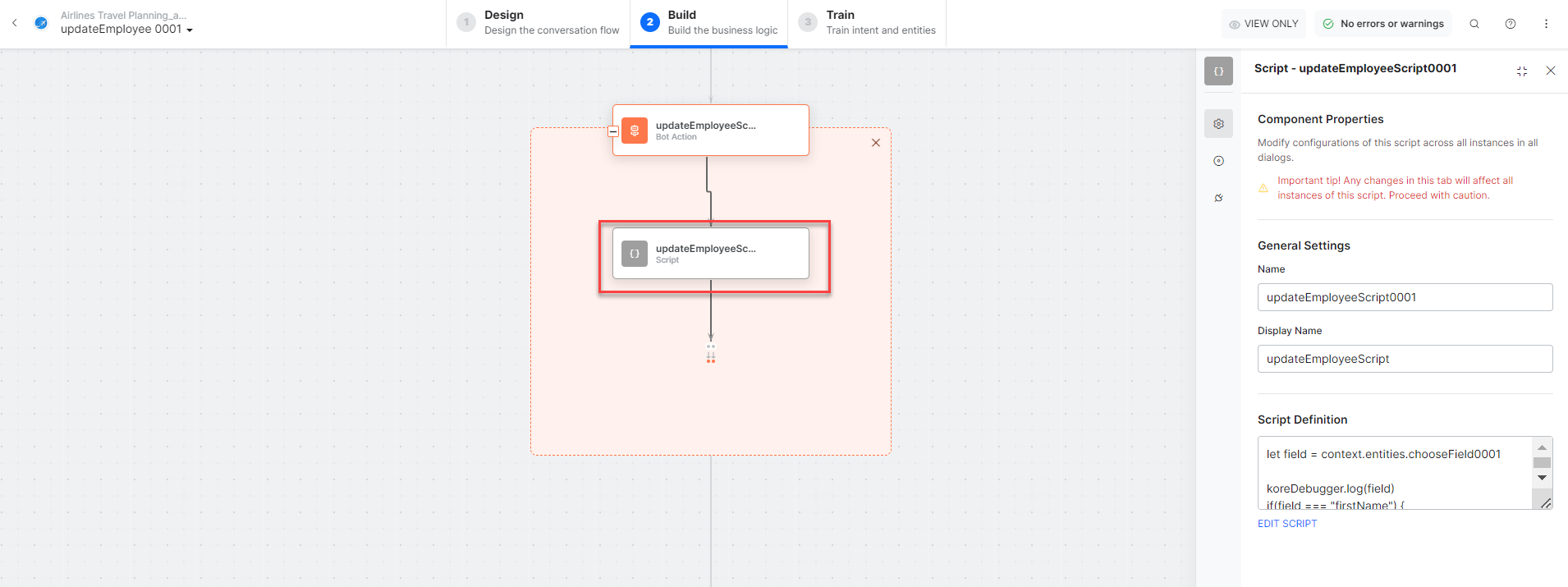 - updateEmployeeMessage – A message node with script to display responses for various scenarios.