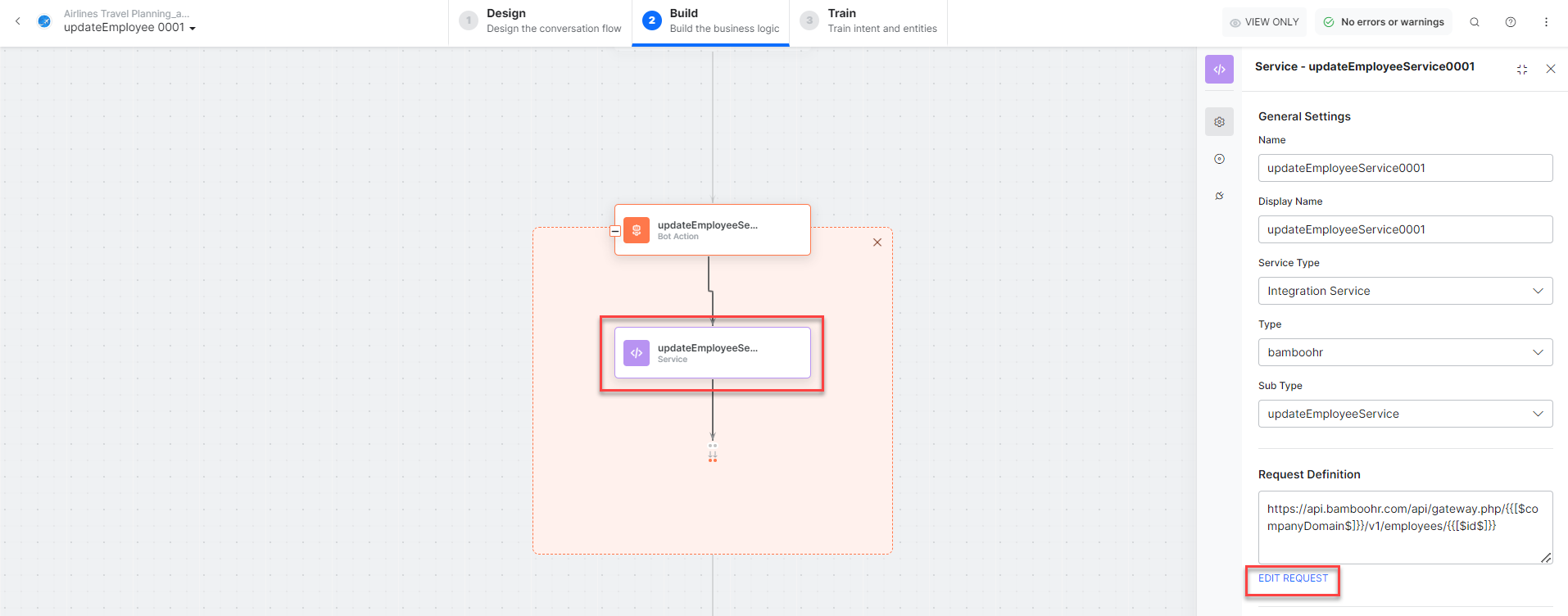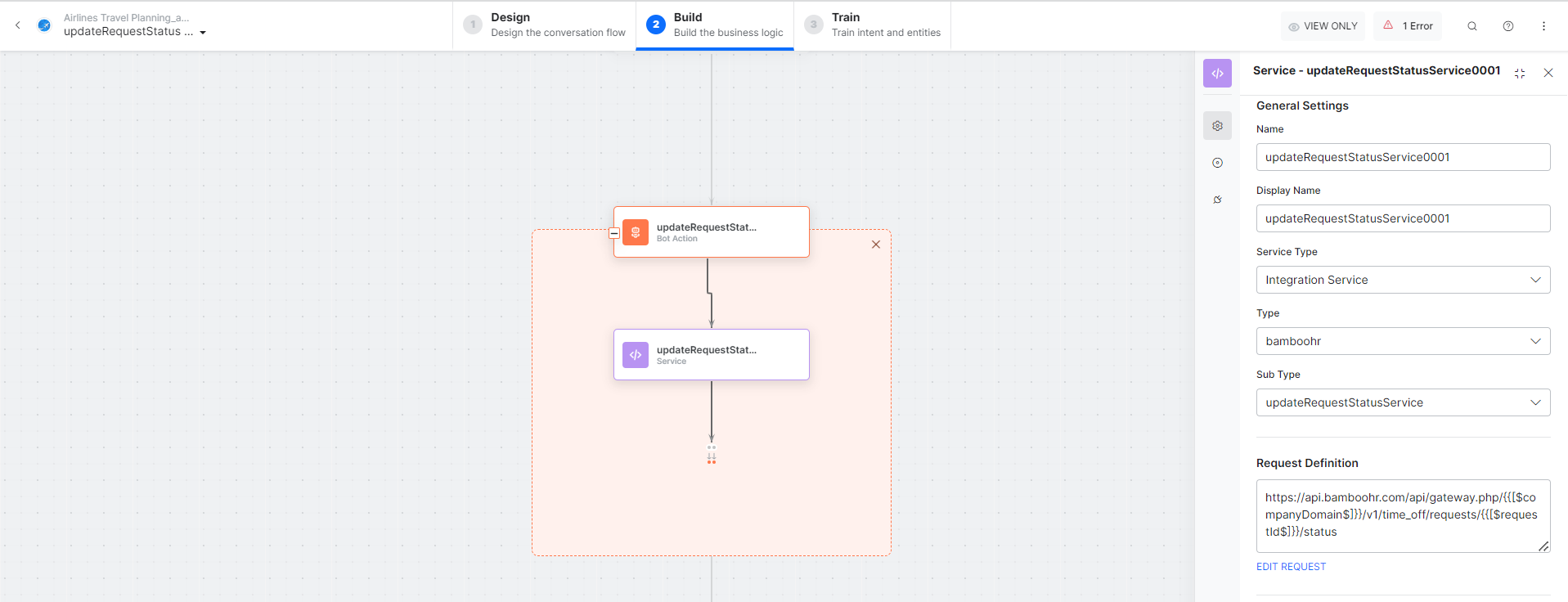 updateRequestStatusService – A bot action service to update an employee in an external integration. Click the Plus icon to expand to view the updateRequestService bot action component properties.