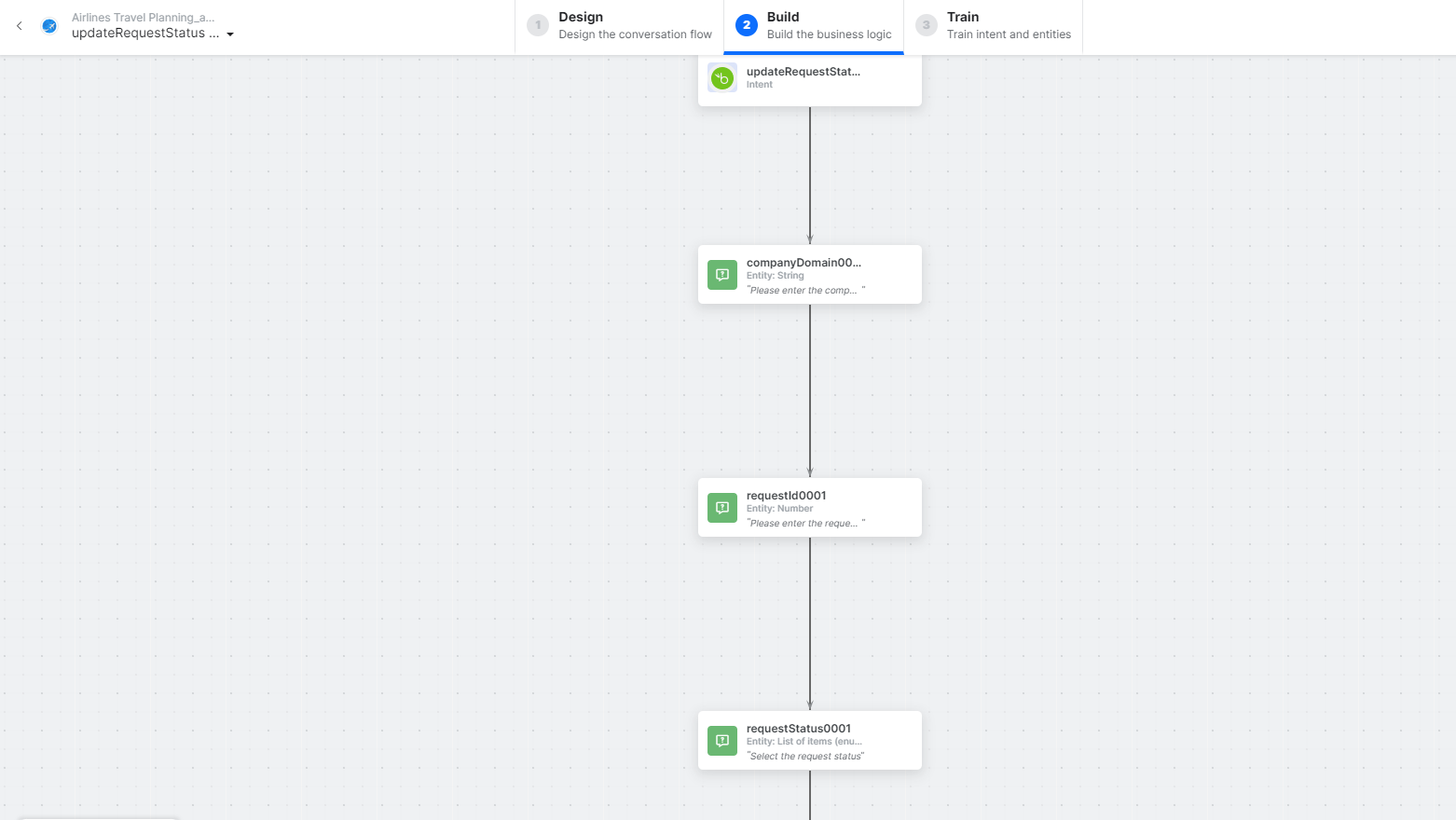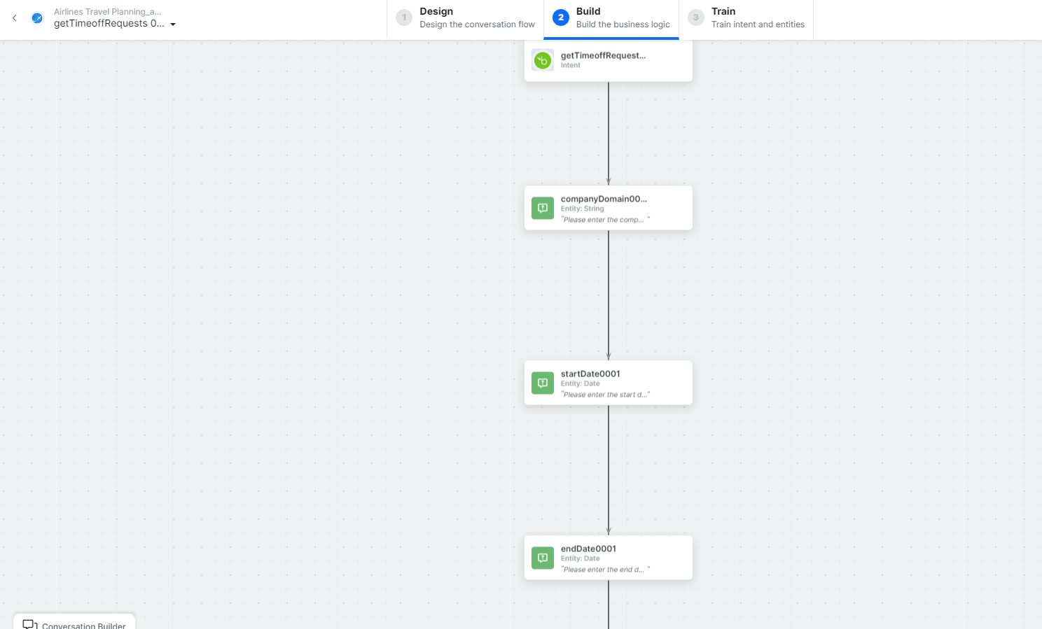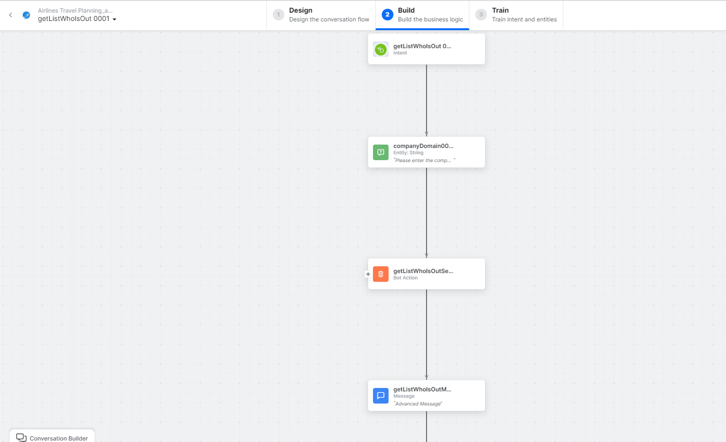 Click the auto-created dialog. The the canvas opens with all required entity nodes, service nodes, and message scripts.