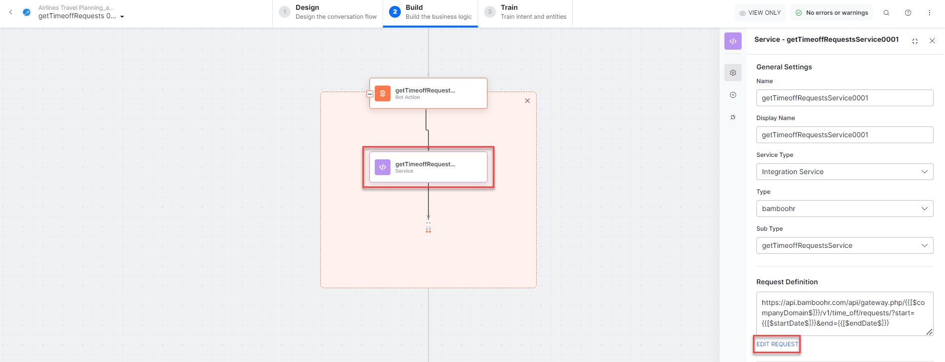 - companyDomain, startDate, and endDate– Entity nodes for gathering the required employee details getTimeoffRequestsService – A bot action service to fetch time off requests in an external integration. Click the Plus icon to expand to view the getTimeoffRequestsService bot action component properties.