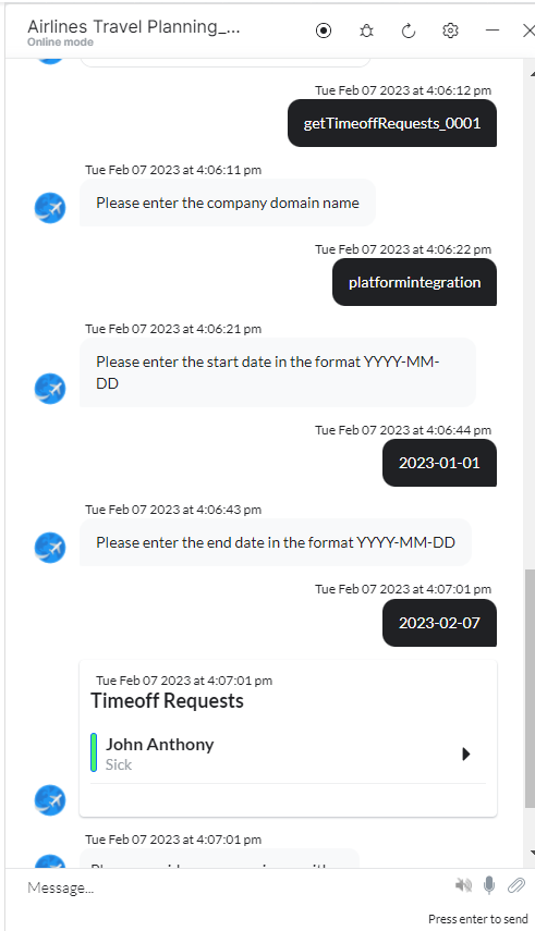 - Follow the prompts in the App console to get all time off requests as shown below: