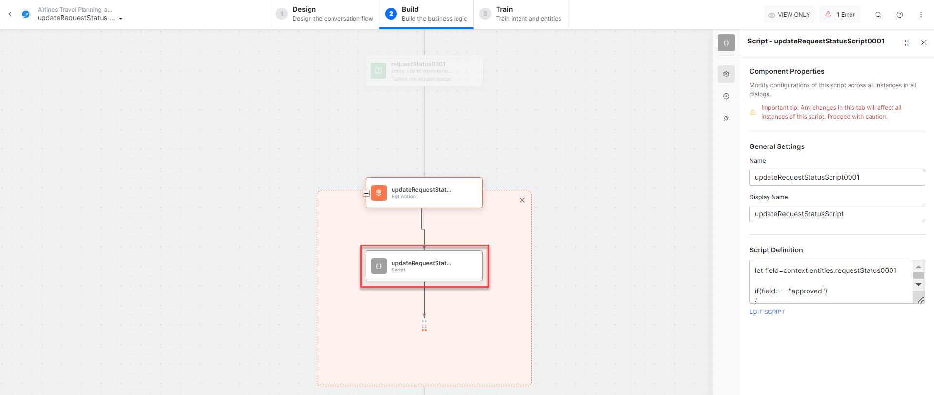 updateRequestStatusMessage – A message node with script to display responses for various scenarios.
