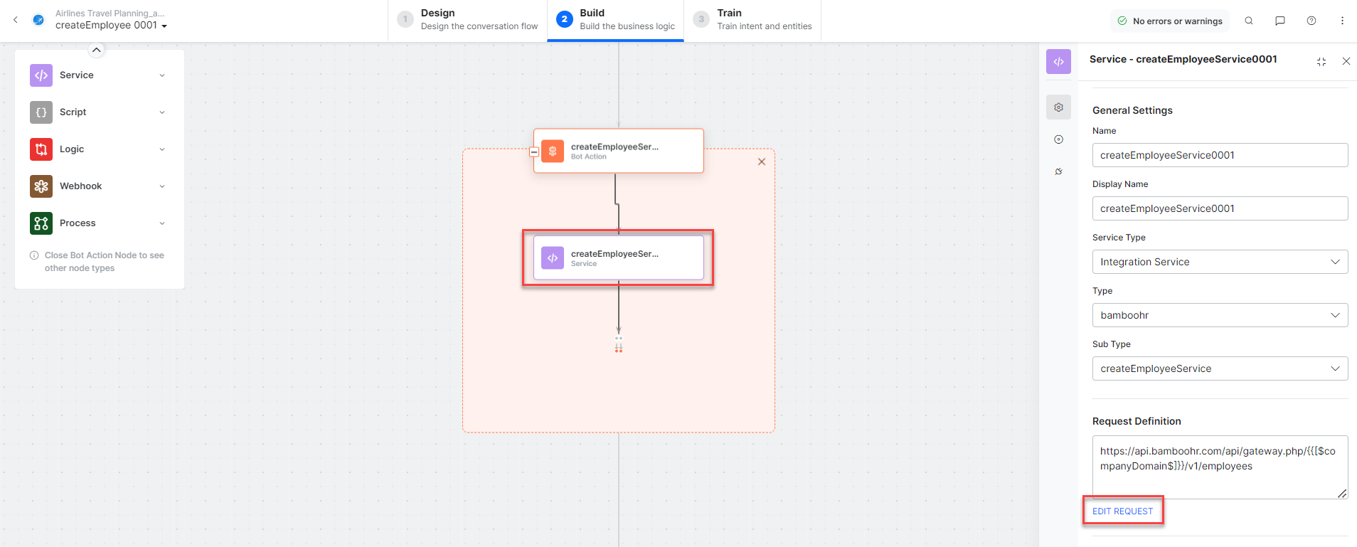 - createEmployeeService – A bot action service to create an employee in an external integration. Click the Plus icon to expand to view the createEmployeeService bot action component properties.