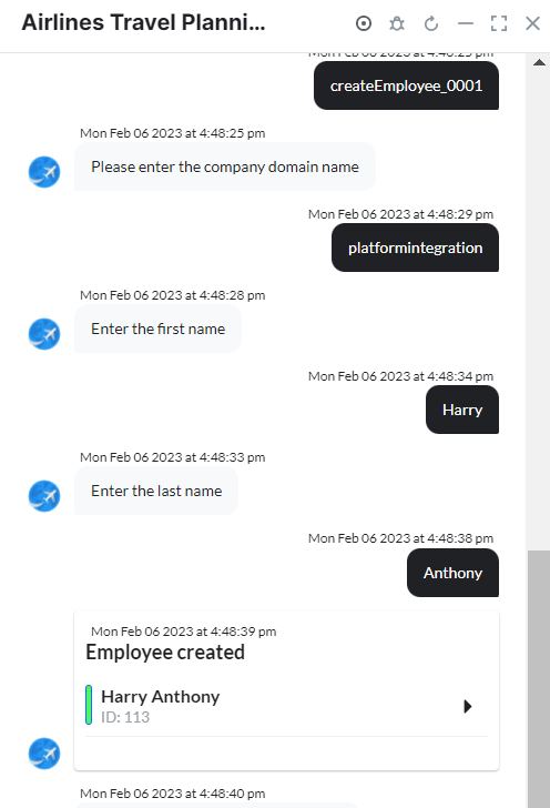 - Follow the prompts in the App console to create an employee as shown below: