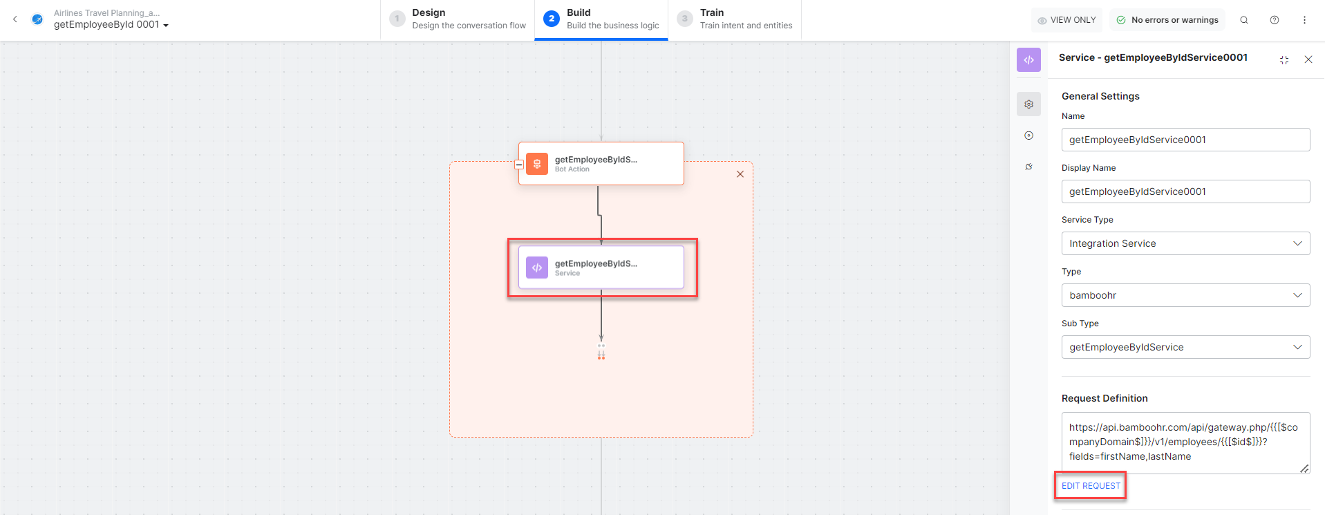 - getEmployeeByIdService – A bot action service to find an employee by an ID from an external integration. Click the Plus icon to expand to view the getEmployeeByIdService bot action component properties.