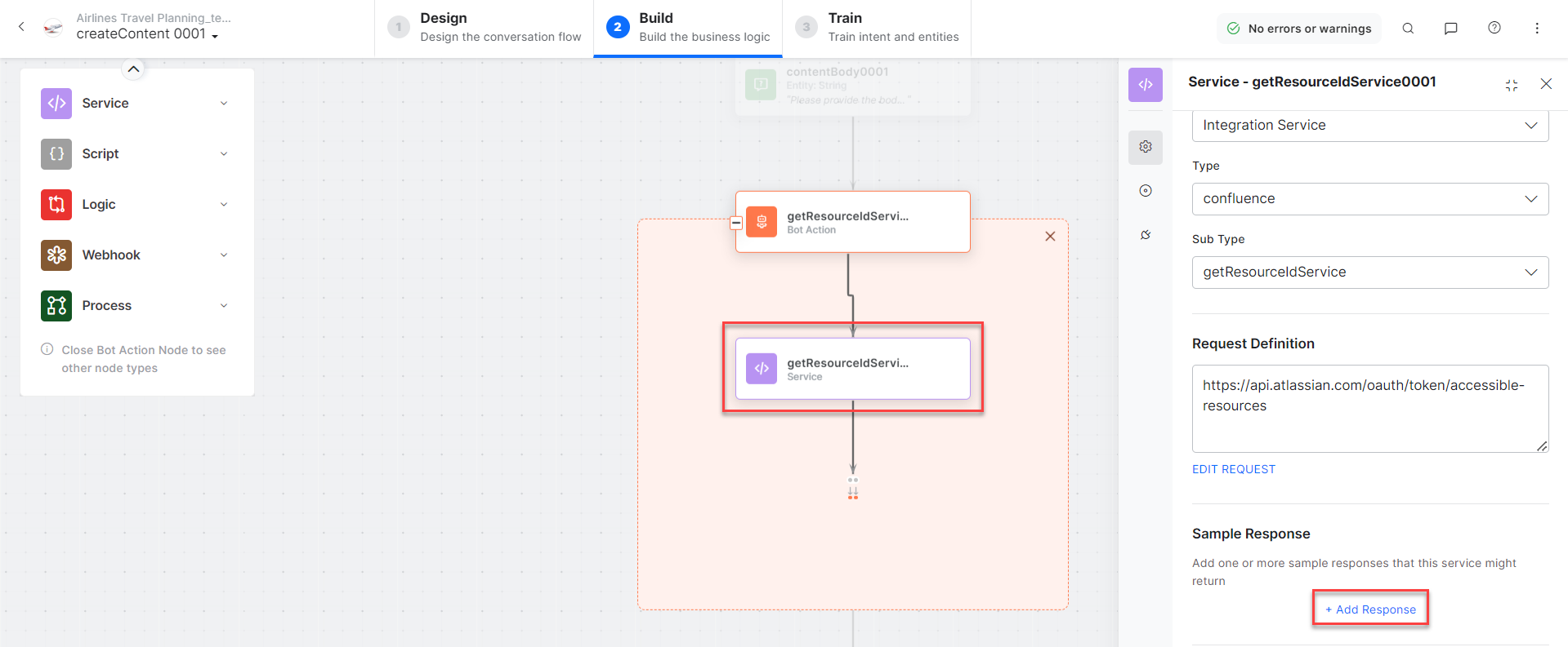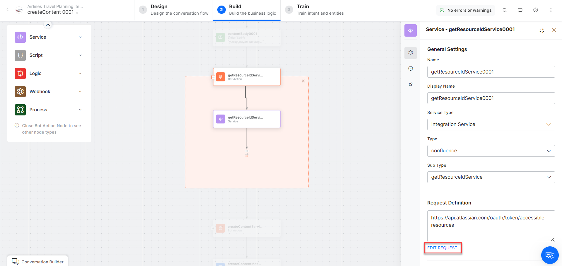 createContentService – A bot action service to create content in the Confluence space. Click the Plus icon to expand to view the createContentService bot action component properties. In the Component Properties window, click the Edit Request link to edit the request parameters.