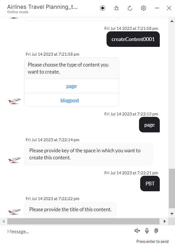 Follow the prompts in the AI Agent console to create content on Confluence as shown below: