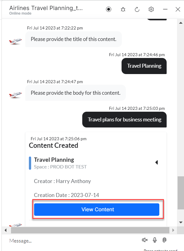 You will notice that content is created with the title and body on Confluence. Expand and click the View Content button.
