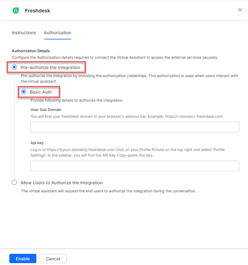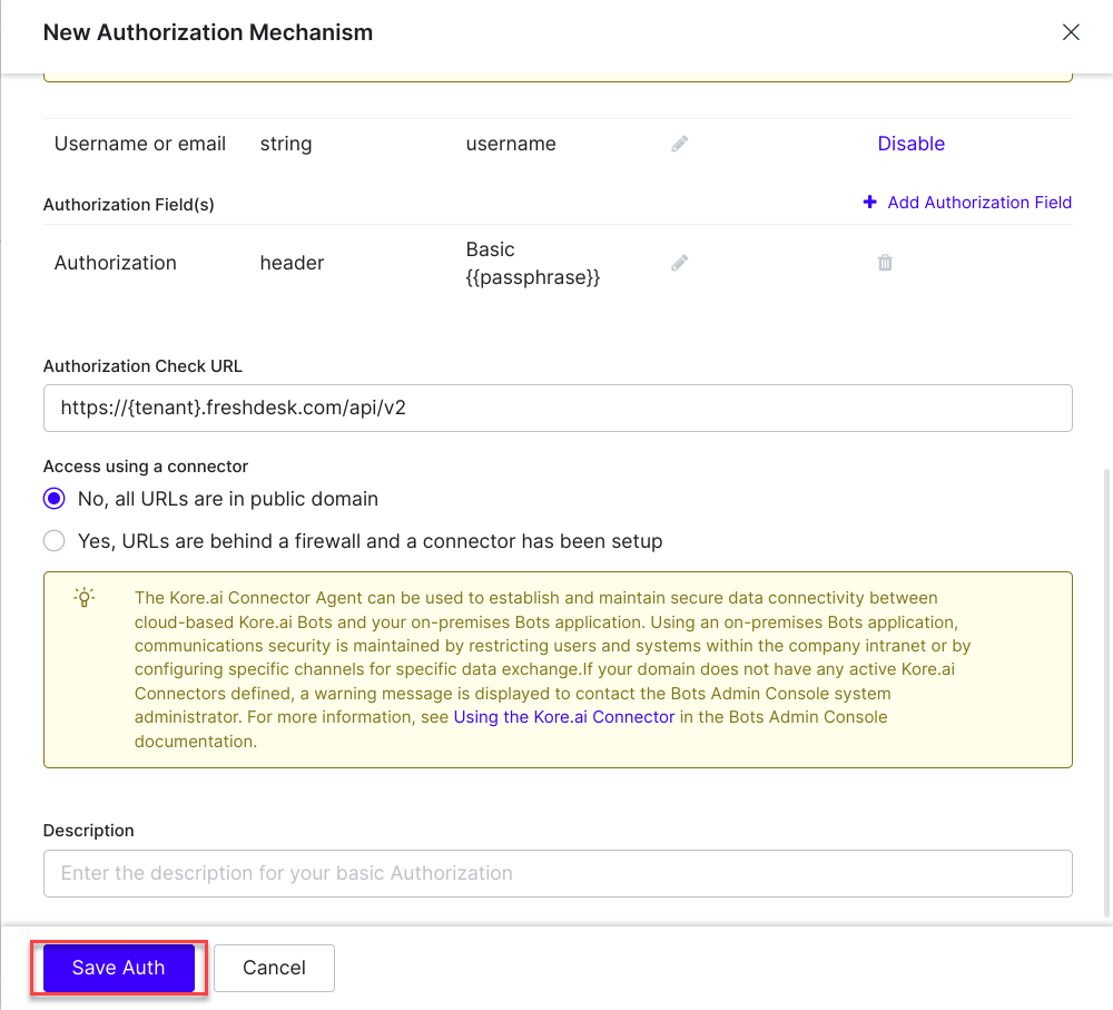 The Kore.ai XO Platform supports the following authorization types for the Freshdesk integration: