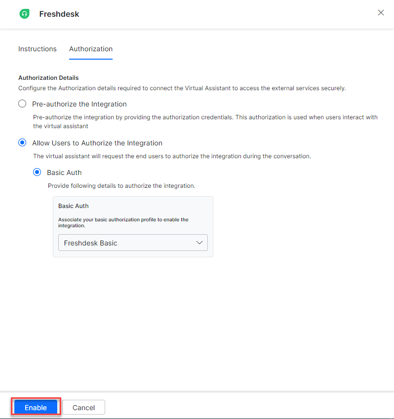 You can authorize the integration at a user level with their login credentials. The user authorization process involves requesting permission for Kore.ai’s Freshdesk app to access an access token at runtime. You can also use the basic auth profile to let a user configure the integration at runtime.