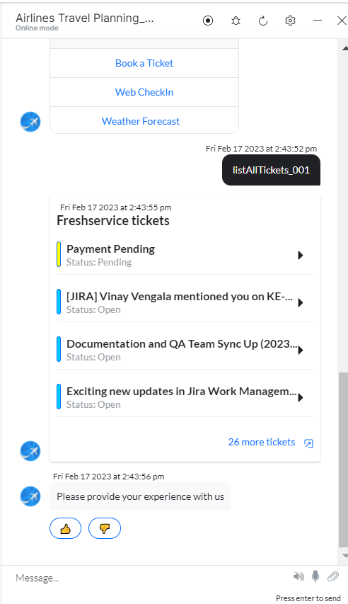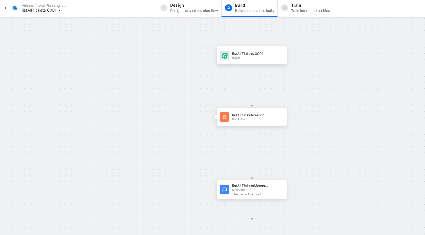 listAllTicketsMessage – A message node with the script to display responses for various scenarios.