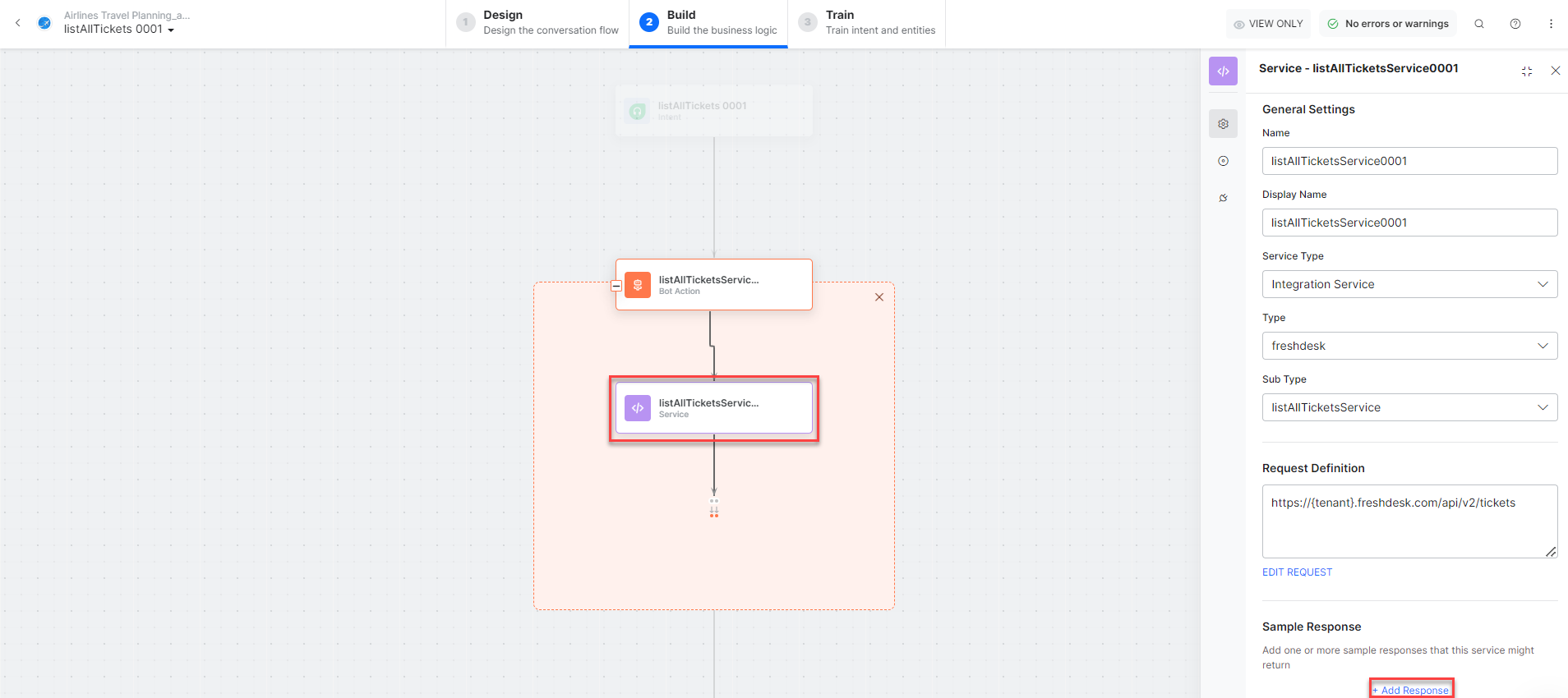 - listAllTicketsService – A bot action service to fetch all tickets from an external integration. Click the Plus icon to expand to view the listAllCustomersService bot action component properties.