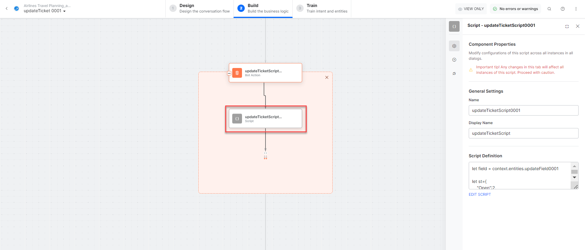 updateTicketMessage – A message node with the script to display responses for various scenarios.