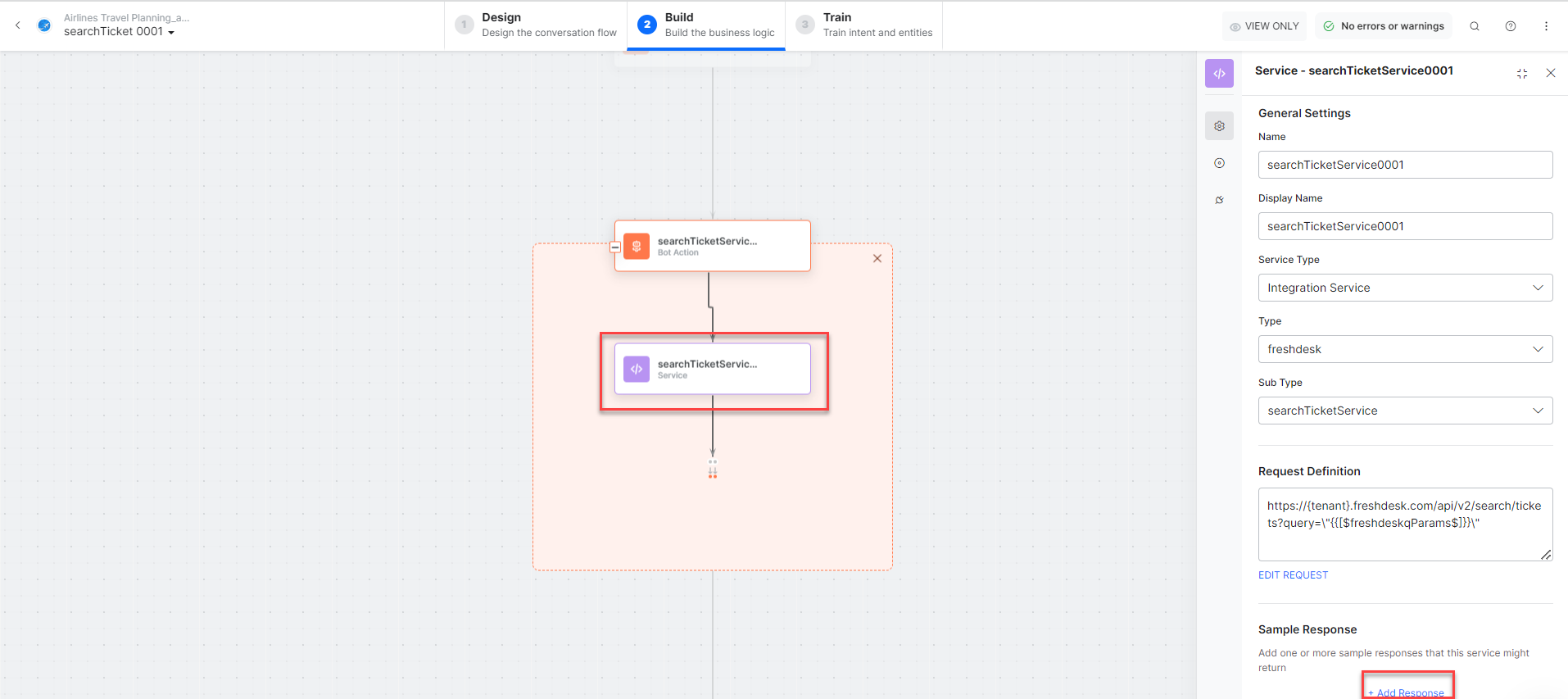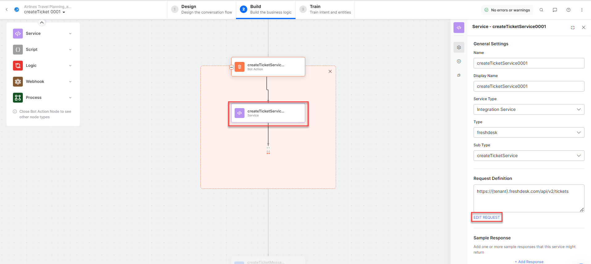 - createTicketService – A bot action service to create a ticket in an external integration. Click the Plus icon to expand to view the createTicketService bot action component properties.