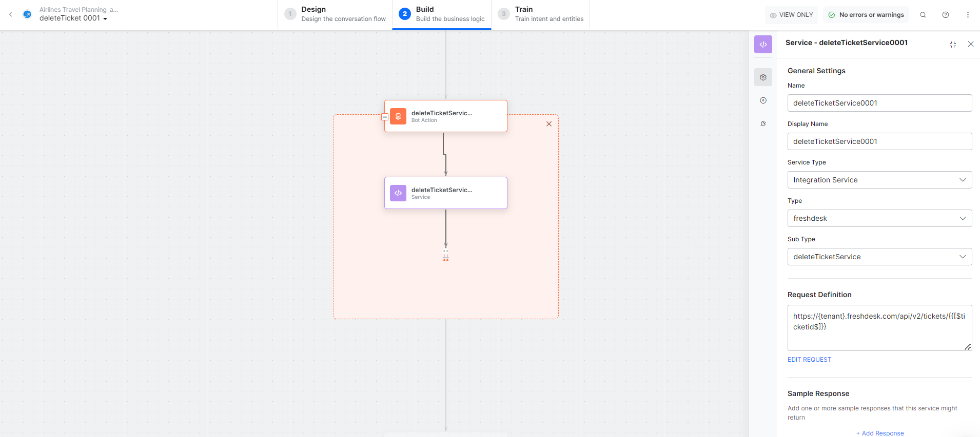 - deleteTicketService – A bot action service to delete a ticket in an external integration. Click the Plus icon to expand to view the deleteTicketService bot action component properties.