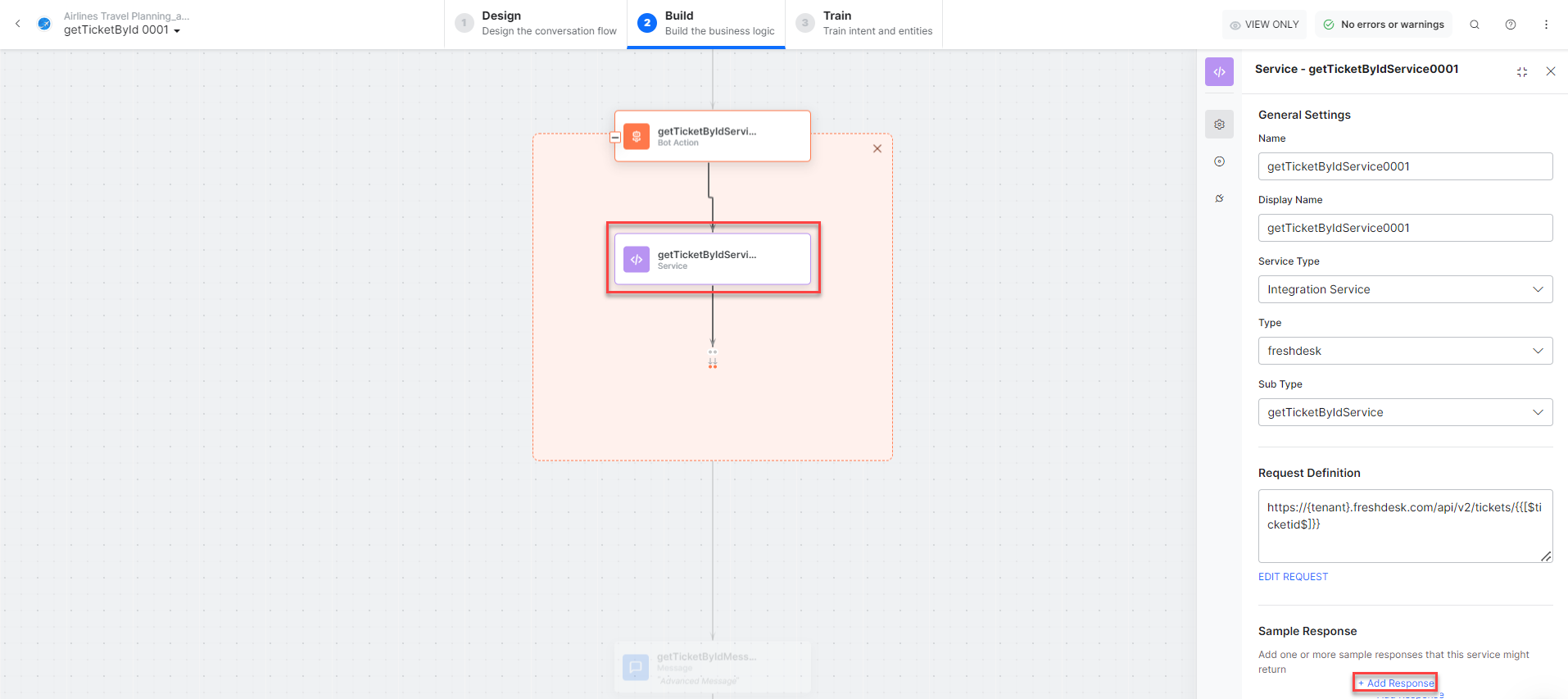 - getTicketbyIdService – A bot action service to find a ticket in an external integration. Click the Plus icon to expand to view the getTicketbyIdService bot action component properties.