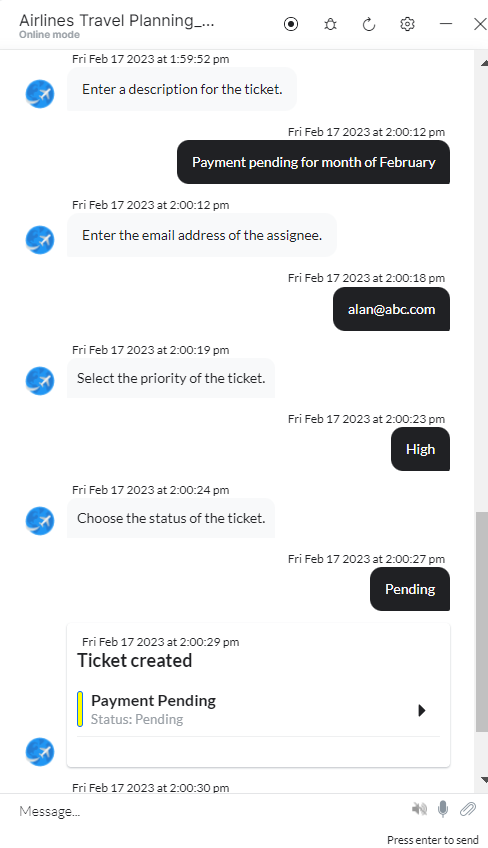 - Click the Talk to Bot icon to test and debug the dialog task.