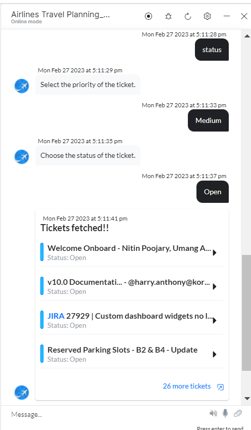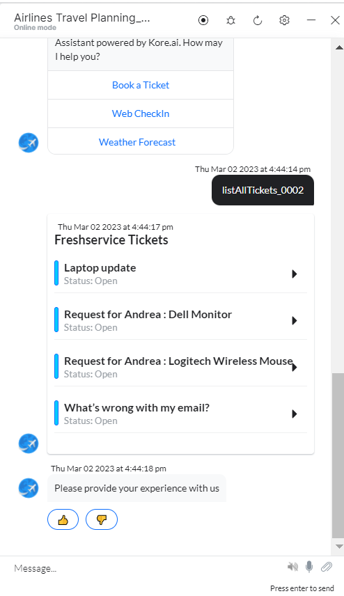 listAllTicketsMessage – A message node with the script to display responses for various scenarios.
