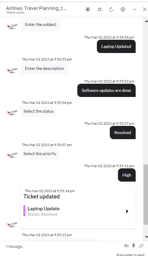 - subject, description, email, priority, status, and phone – Entity nodes for gathering the required ticket details.