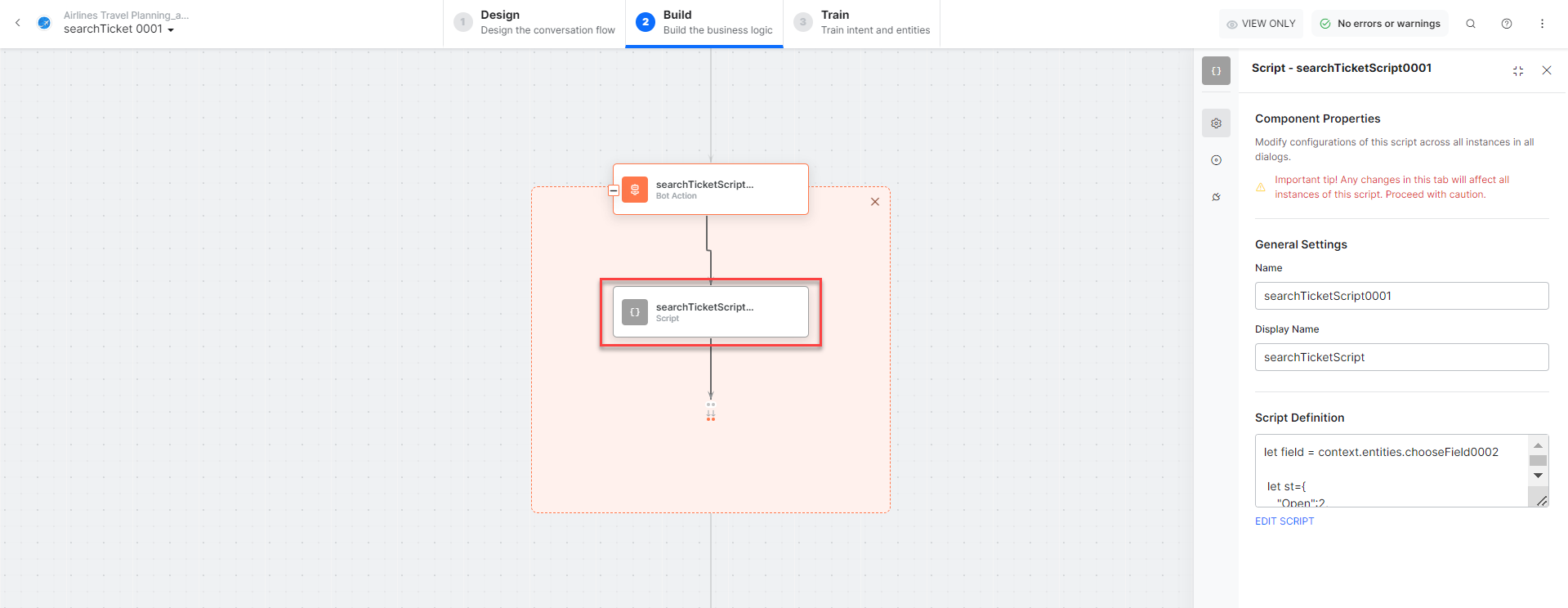 searchTicketMessage – A message node with the script to display responses for various scenarios.