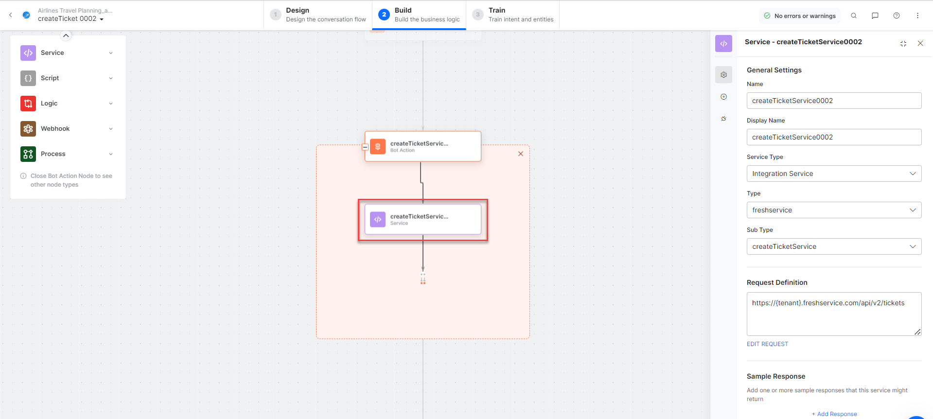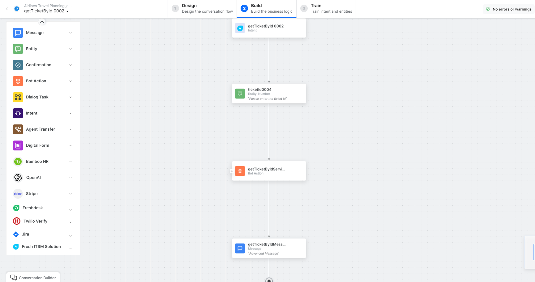 You can use the Prebuilt Action Templates from your Freshservice integration to auto-create dialog tasks and test them using the Talk to Bot option.