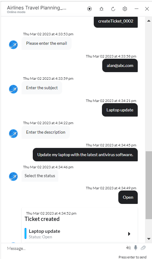 - Click the Talk to Bot icon to test and debug the dialog task.