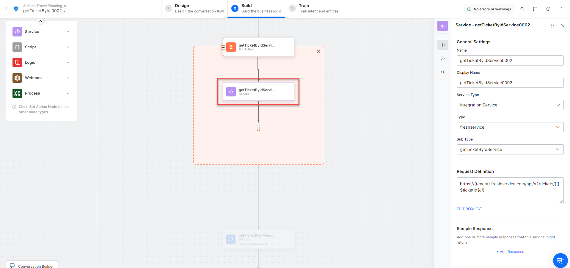 - getTicketbyIdService – A bot action service to find a ticket in an external integration. Click the Plus icon to expand to view the getTicketbyIdService bot action component properties.